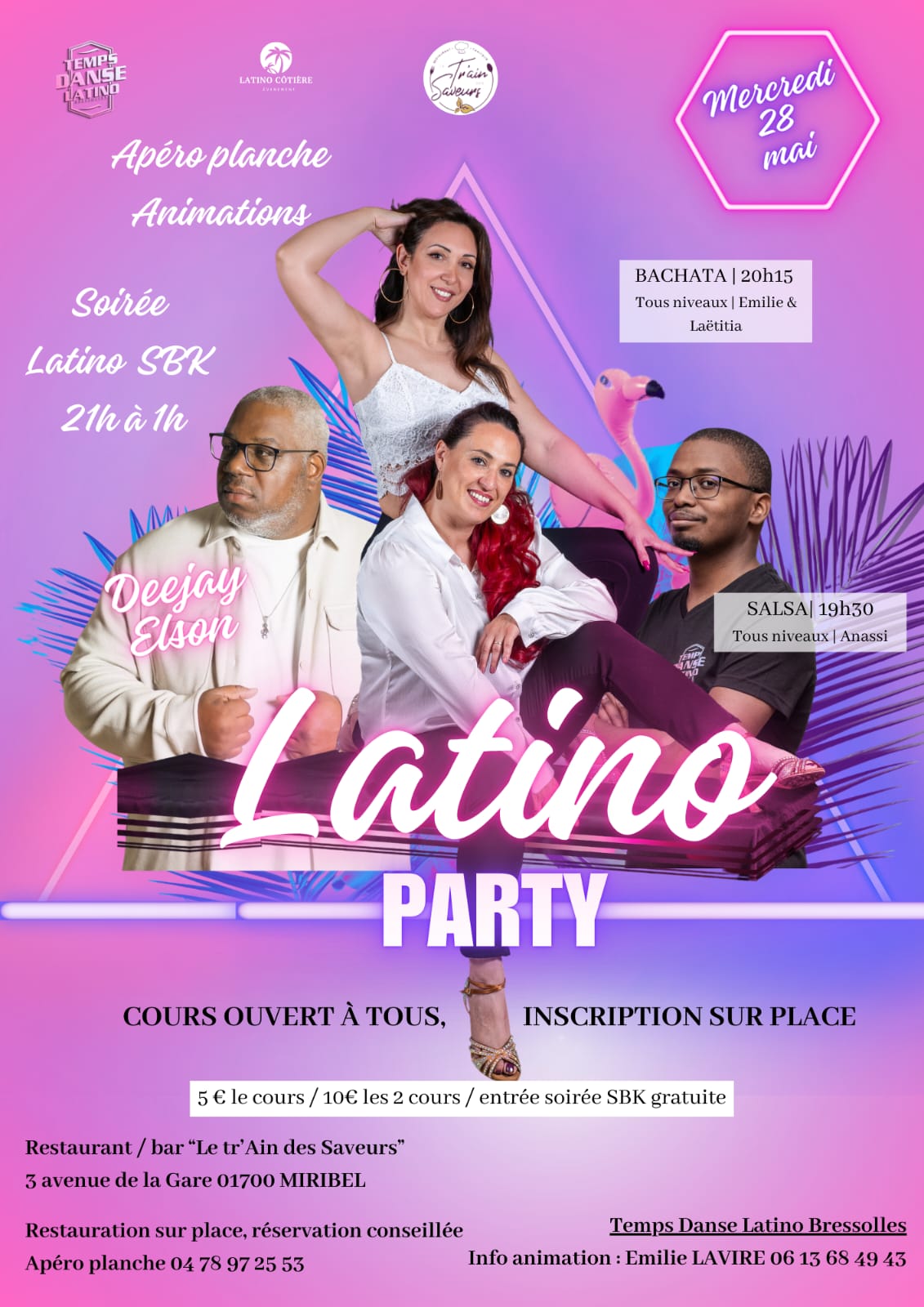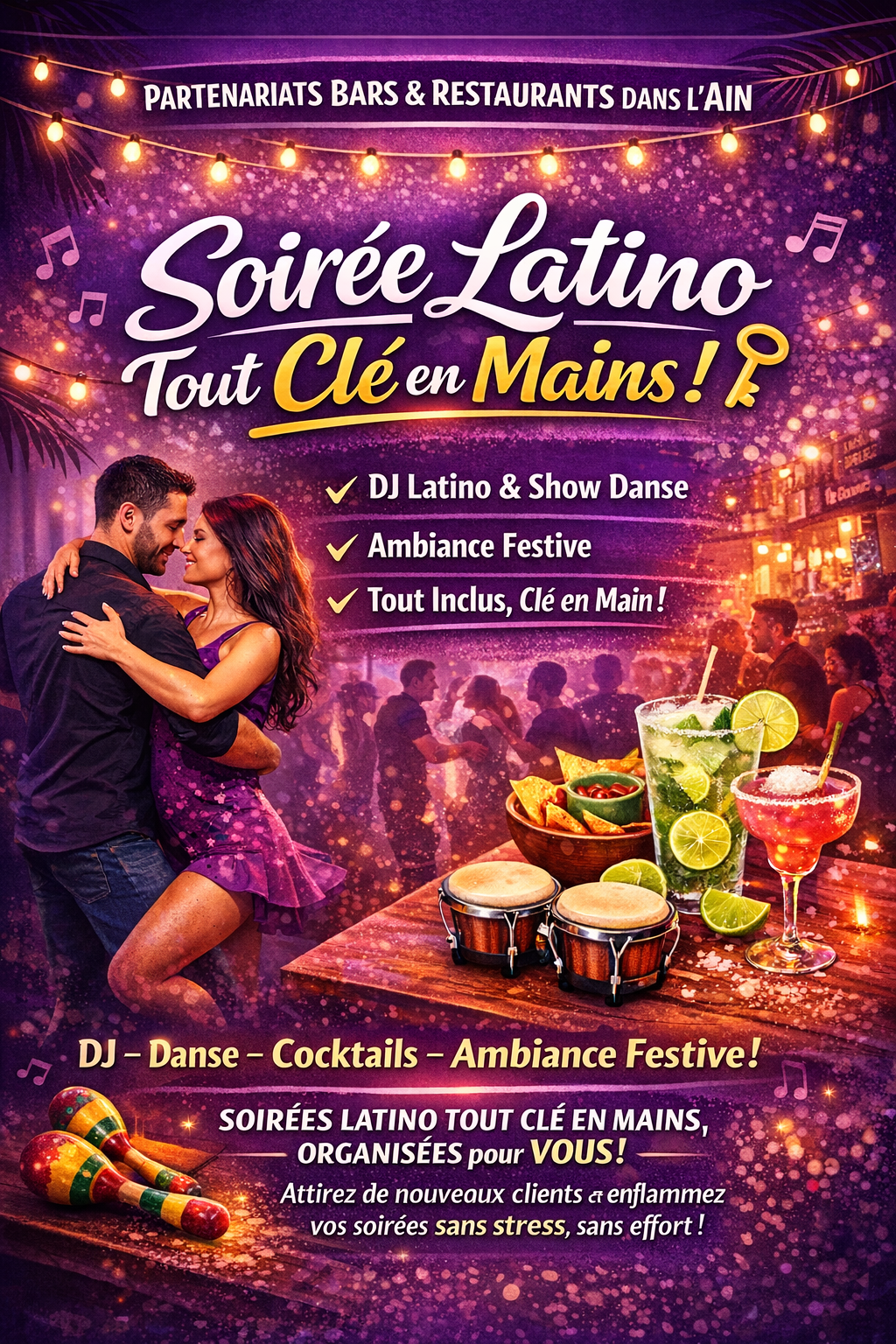 Nous vous proposons des formules modulables ou clés en main pour assurer une ambiance festive et caliente auprès de vos clients, avec des animations sur le thème des danses latines. Formule Clés en main : Animation Latino + DJ Latino, Matériel (lumière & son), Création du visuel de l'événement, communication sur les réseaux sociaux, garantie 100 participants minimun Formule basique : Animation Latino + DJ Latino, garantie 50 personnes Formule LIGHT : Animation Latino uniquement, garantie 30 personnes